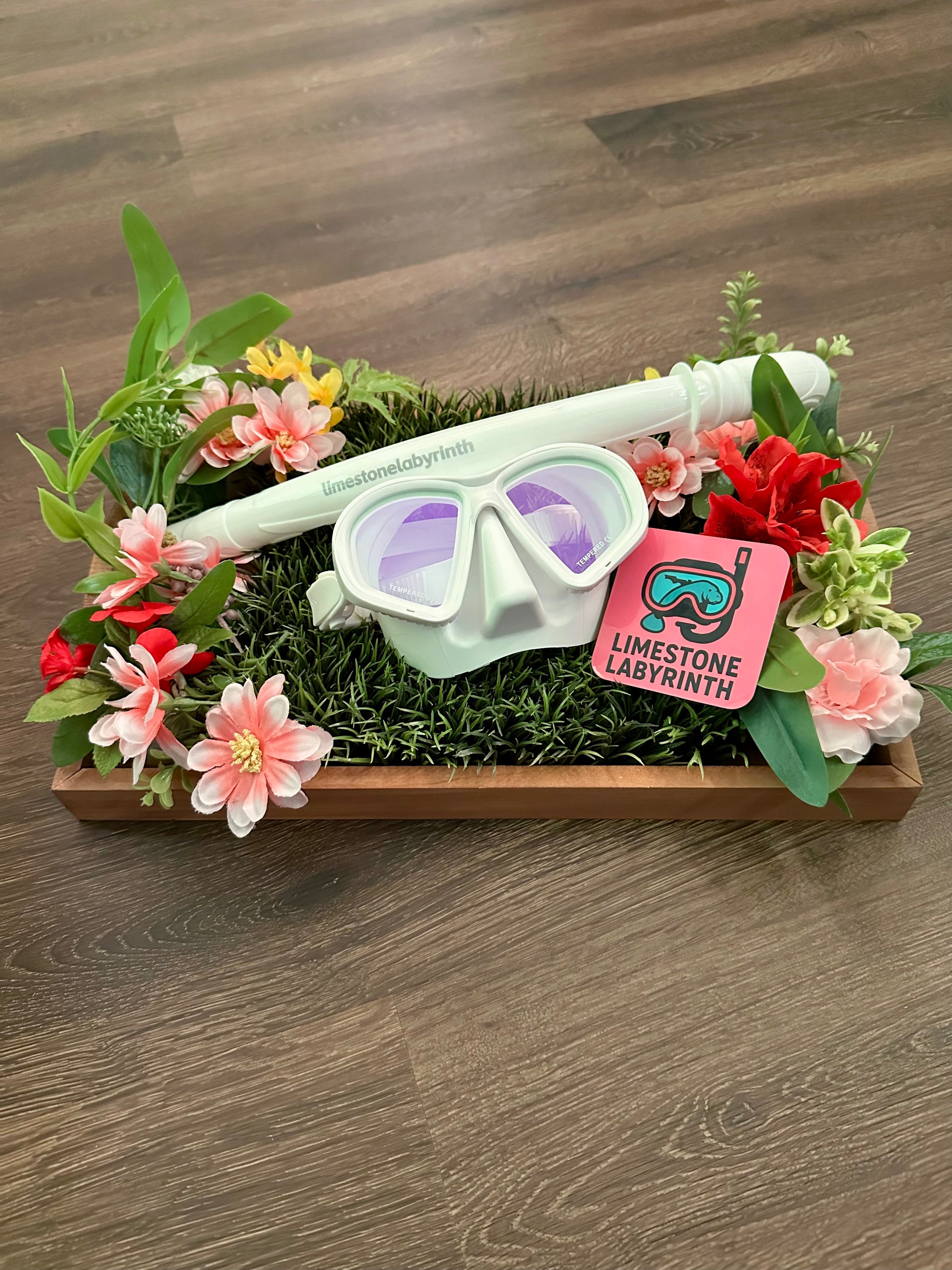 Purple tinted glass. CE Certified silicone snorkel mask and snorkel tube. Tempered glass, made for adult use.